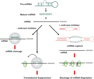 miRNA 抑制剂克隆导入细胞后表达的miRNA抑制剂(miArrest)特异地结合它们的靶miRNA。miRNA抑制剂转录后折叠形成一个稳定的陷阱结构,可以结合两分子靶miRNA。miArrest?高效、特异地结合细胞内成熟的靶miRNA,阻止了miRNA对靶标mRNA的降解或者翻译抑制,上调miRNA靶标基因的表达。独特的载体设计确保最大的特异性、抑制强度、抑制作用持久度和最低的脱靶效应。