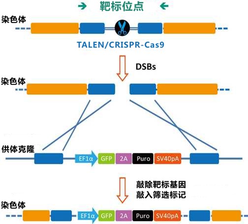 通过CRISPR/TALEN工具制造DNA 双链断裂介导同源重组,将供体克隆上的报告基因和筛选标记表达结构靶向整合到基因组上的目标位点。