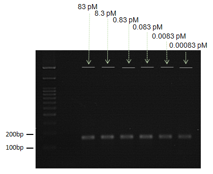 图2.DNA标准品扩增产物电泳图。使用NGSquant? Library qPCR Kit for Ion Torrent扩增文库DNA标准品得到的qPCR产物,电泳显示条带均一,无非特异扩增现象。